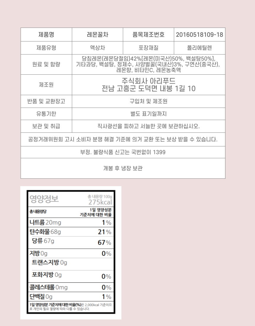 새콤달콤 레몬꿀차가 60g 큰컵용으로 나왔습니다.